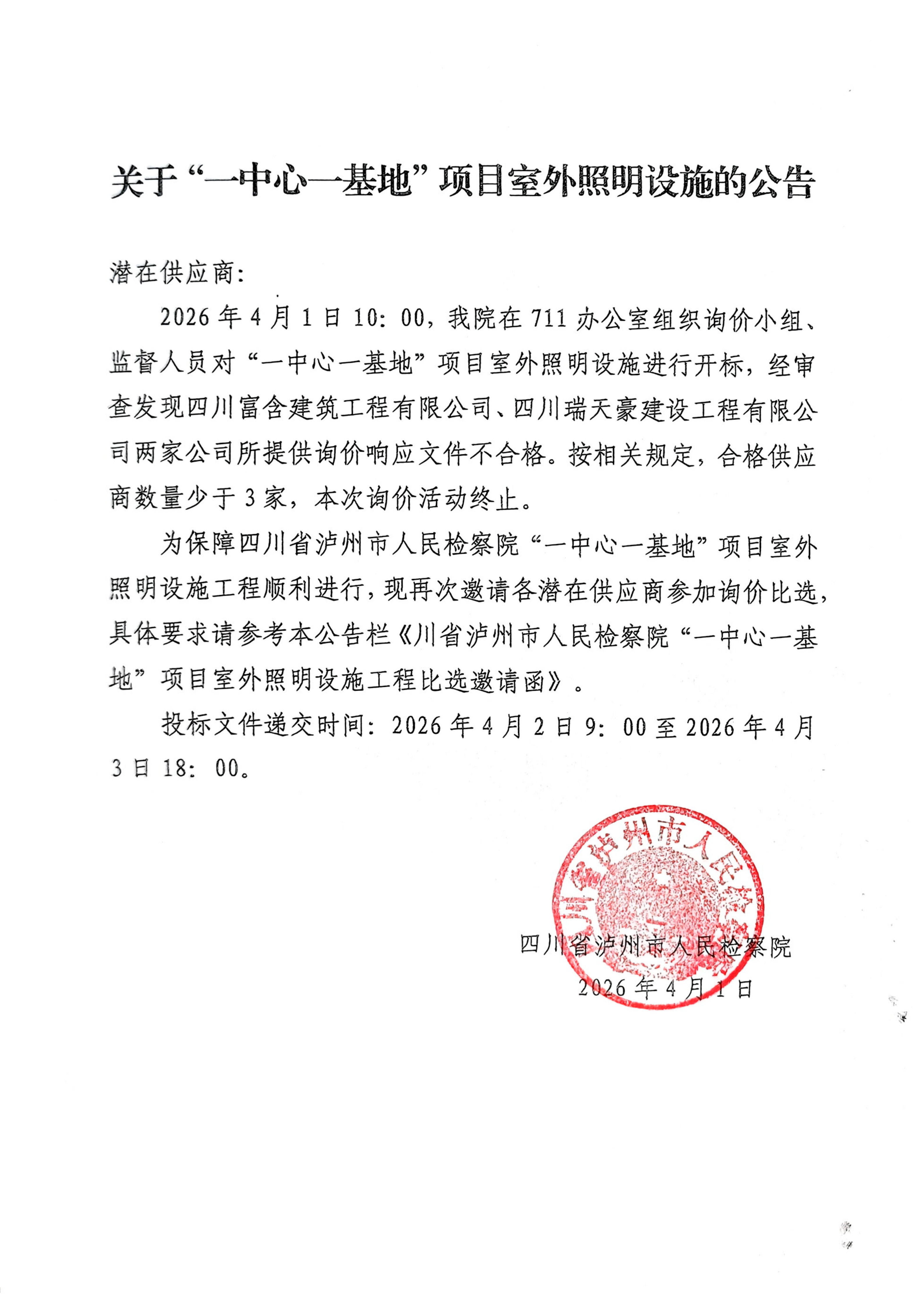 关于一中心一基地项目室外照明设施的公告